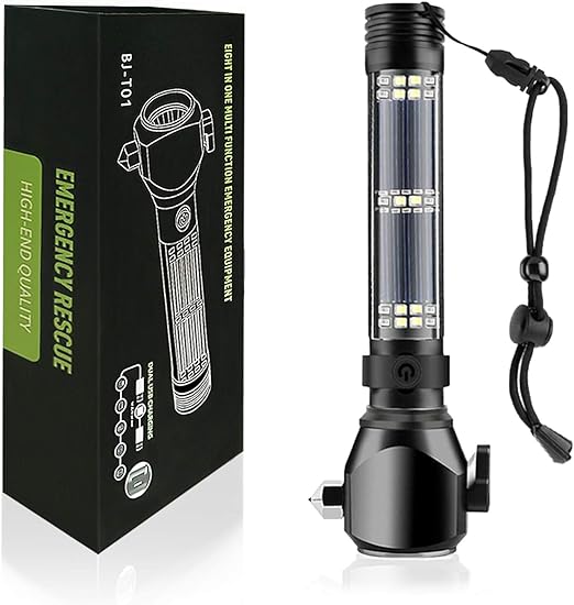 - [Multi Function] Outstanding USB/solar dual rechargeable flashlight with 7 working modes(Headlight-High, Medium and Strobe, White sidelight- High and Medium, SOS mode-flashing red and blue alternately like a police light. It can also play the role of window breaker, seatbelt cutter, 120DB alarm and even power bank. A tactical flashlight for camping, hiking, or outdoor survival challenging.