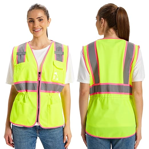 Hi Vis Safety Vest for Women,Working Drawstring Waist Construction Vest with Pockets and Zipper,Womens Safety Vest,ANSI Type R Class2