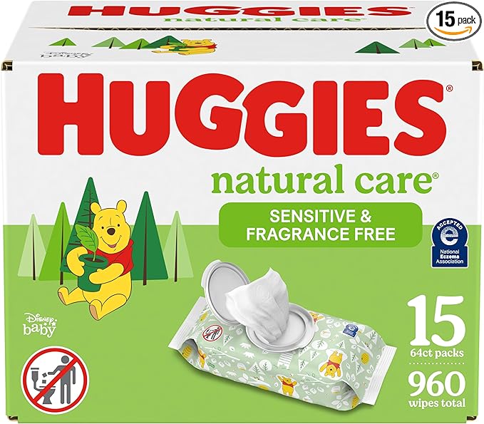 - 15 flip-top packs of 64 Huggies Natural Care Sensitive Baby Wipes, Unscented (960 wipes total)