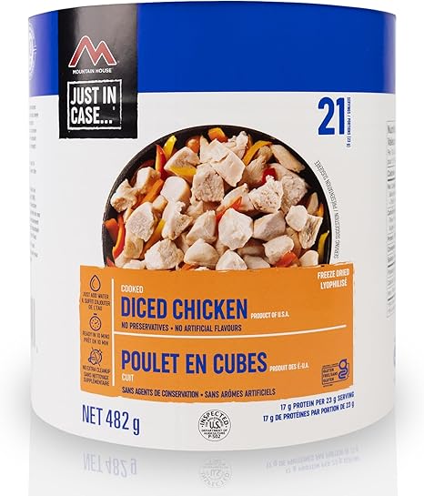 FREEZE DRIED MEAT – An excellent source of protein, use Mountain House cooked, diced chicken in any recipe requiring chicken like stews, soups, and chili.