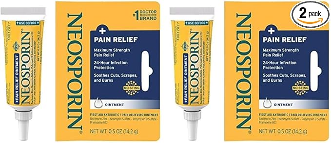- .5-ounce tube of Neosporin + Pain Relief Dual Action Topical Antibiotic Ointment for first aid wound care from the #1 doctor recommended brand
