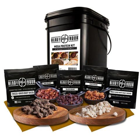 These Ready Hour foods are packed in resealable, heavy-duty 4 layer pouches, the meats and beans in this protein kit deliver. They last up to 30 years in storage. A rugged, water resistant bucket measuring 8″ x 9″ x 13.5″ for long-term storage is included.  Total of 9,360 calories with 820g of protein.