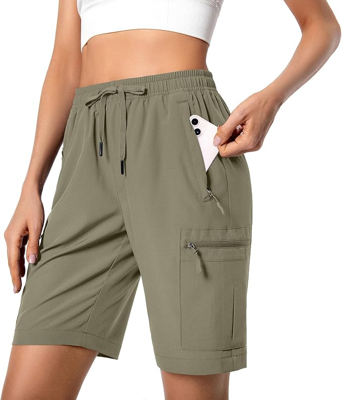• Water Resistant & Sun Protection: The lightweight bermuda shorts for women which moisture wicking fabric is treated with a durable water repellent(DWR) to shed light rain and stains. And made with stretch-woven fabric and build-in UPF 50+ to provide great protection against harmful ultraviolet rays during outdoor activities.