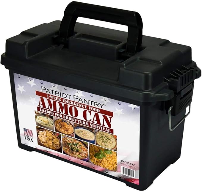 - Prepare with America’s best-selling emergency food supplier – prepare with Patriot Pantry. When you choose our 1-week emergency food supply ammo can to supplement your food storage plan, you’ll be better prepared for any emergency that comes your way, with 42 servings of delicious meals. The food supply averages 1, 500+ calories per day. Get to have on hand for short-term emergencies, including power loss, blizzards, earthquakes, and hurricane. The tasty food inside your 1-week food ammo can: Black bean & rice soup (4 servings) Maple Grove oatmeal (8 servings) traveler’s stew (4 servings) long grain white rice (10 servings) mac & cheese (8 servings) Creamy flavored chicken (4 servings) home-style potato soup (4 servings) when it comes to your preparedness plan, you want The best. As active participants in the preparedness lifestyle, we personally test and use all of our products. If it isn’t good enough for our own families, We won’t sell it. Period. That’s our Patriot Pantry promise to you.